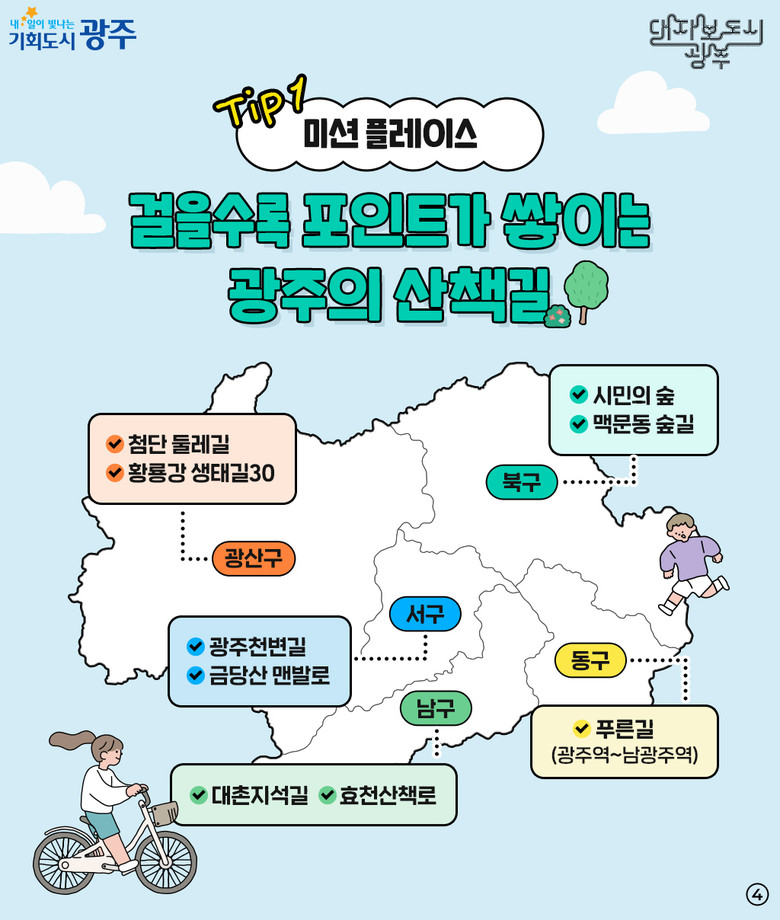 오는 9월부터 11월까지 시범운영하는 ‘시민참여수당’ 참여도 눈길을 끈다. 이 사업은 지속가능한 대·자·보(대중교통·자전거·보행 중심) 도시 구현을 위한 것으로, 모바일 애플리케이션 ‘워크온(Walk On)’을 통한 일상생활 속 실천활동에 최대 3만포인트의 보상이 주어진다. 광주시는 시범사업 참여자 2000명을 모집하고 있으며, 9월부터 본격적인 운영에 들어간다.