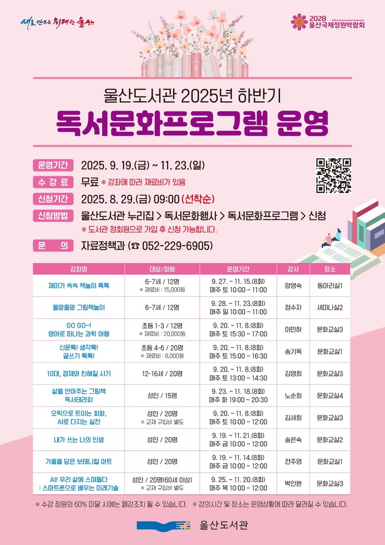 8월 29일 오전 9시부터 울산도서관 누리집(library.ulsan.go.kr)을 통해 선착순 모집하며, 도서관 정회원만 신청 가능하다.
