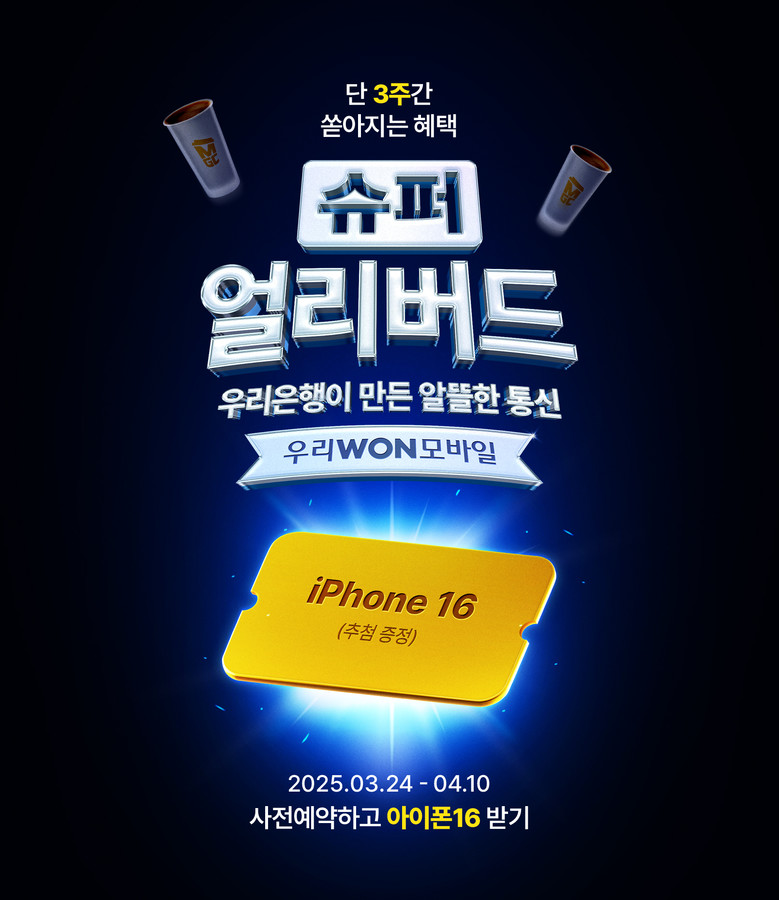 우리WON모바일 사전예약 이벤트는 우리WON뱅킹에서 알뜰폰을 사전예약만 해도 추첨을 통해 총 5만명 고객에게 모바일 커피 쿠폰을 제공한다. 사전예약 후 알뜰폰을 개통한 고객에게는 △아이폰16 (10명) △백화점 상품권 1만원권 (1천명)을 추첨을 통해 제공한다. 이번 이벤트를 카카오톡이나 문자 등을 통해 지인에게 공유할 경우 △커피 쿠폰 (1천명) 을 추가로 받을 수 있다.