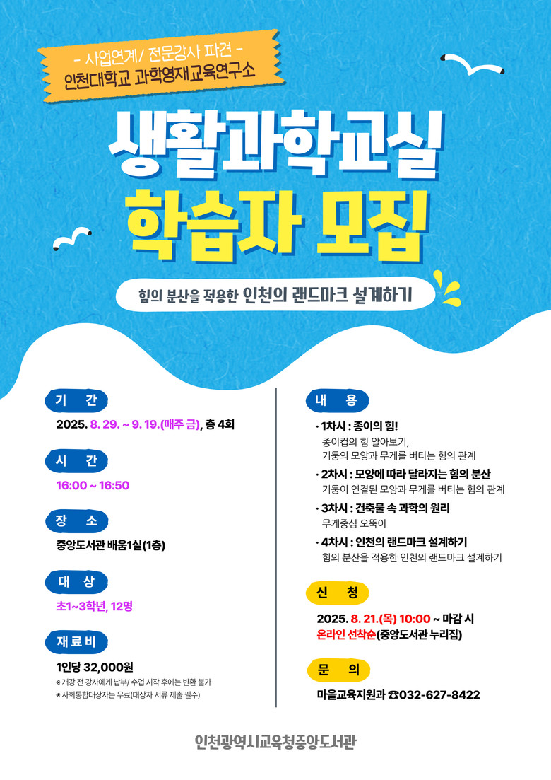 이번 프로그램은 인천대학교 과학영재교육연구소와 연계해 전문 강사가 파견되며, 어린이들이 힘의 분산 원리를 이해하고 이를 바탕으로 인천의 랜드마크를 설계하는 체험 중심의 교육으로 구성된다.