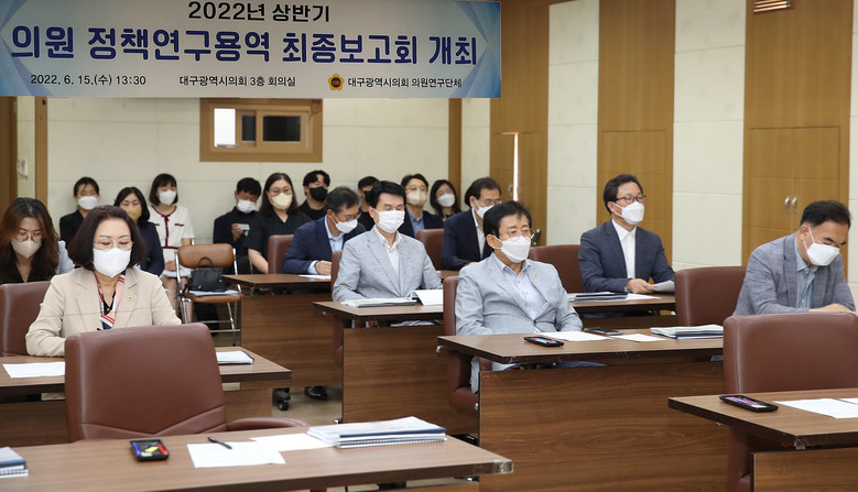 [세계타임즈=대구 한성국 기자] 대구시의회 4개 의원연구단체가 공동으로 주관한 의원 정책연구용역 최종 보고회가 6월 15일(수) 시의회 3층 회의실에서 열렸다. 의원연구단체 소속 시의원들은 그간의 연구 성과를 보고 받고, 제8대 의회 의원 정책연구 활동을 최종 마무리했다.