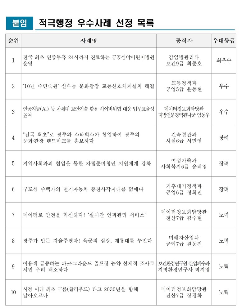 또 담당업무와 상관없이 공적자 개인의 창의적 아이디어로 시작해 지자체 최초로 글로벌 커피브랜드 ‘스타벅스’와 협업, 광주의 문화·관광 랜드마크를 담은 에코백을 제작한 사례(서민영 건축경관과 주무관), 지역사회와의 협업을 통한 자립준비청년 지원체계 강화(송혜영 여성가족과 주무관), 구도심 주택가 전기자동차 충전사각지대 해소(정회진 기후대기정책과 주무관) 등 3명이 장려 등급에 선정됐다.