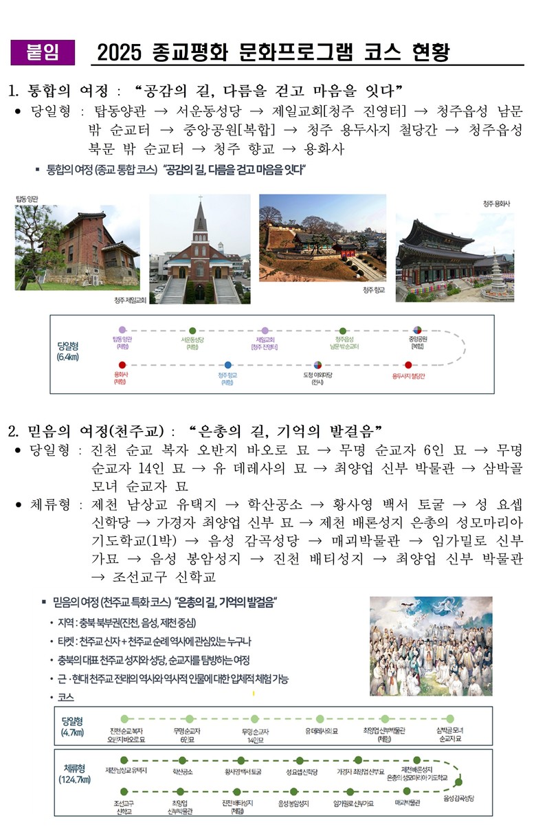 이번 프로그램은 2025년 문화체육관광부 공모사업에 선정된 지역문화 융합 프로젝트로, 중원문화의 역사적 전통과 충청북도의 지역 정체성을 기반으로 종교 간 공존과 화합, 그리고 문화적 이해 증진을 목적으로 기획되었다.