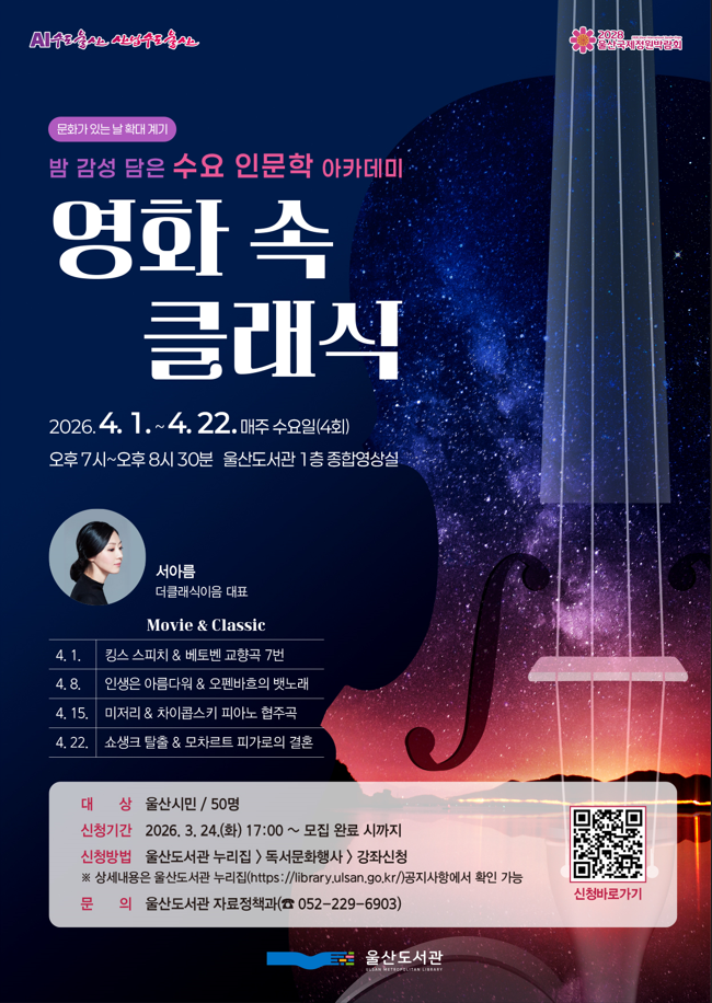 이번 수요 인문학 아카데미 「영화 속 클래식」 강좌는 4월 1일부터 4월 22일까지 매주 수요일 오후 7시, 도서관 1층 종합영상실에서 4회에 걸쳐 진행된다.