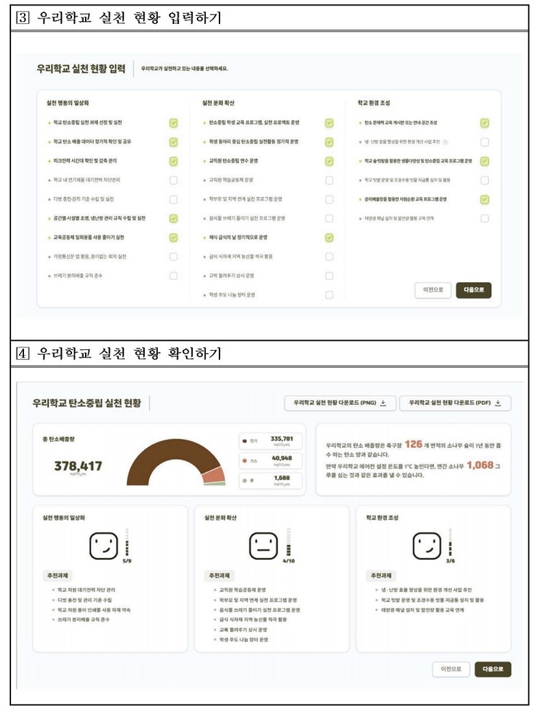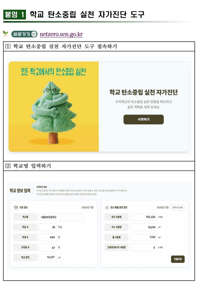 특히 2026년에는‘학교 탄소중립 실천 자가진단 도구’(http://netzero.sen.go.kr)를 새롭게 도입한다. 모든 학교는 이 도구를 활용해 에너지 사용 등 학교의 탄소중립 실천 현황을 점검하고, 그 결과를 바탕으로 학생‧교직원 등 학교 교육공동체가 함께 논의하여 ‘우리학교 실천 과제’를 선정해 연중 실천하게 된다. 서울시교육청은 이를 지원하기 위해 자가진단 도구와 함께 실천 안내서를 모든 학교에 제공할 예정이다.