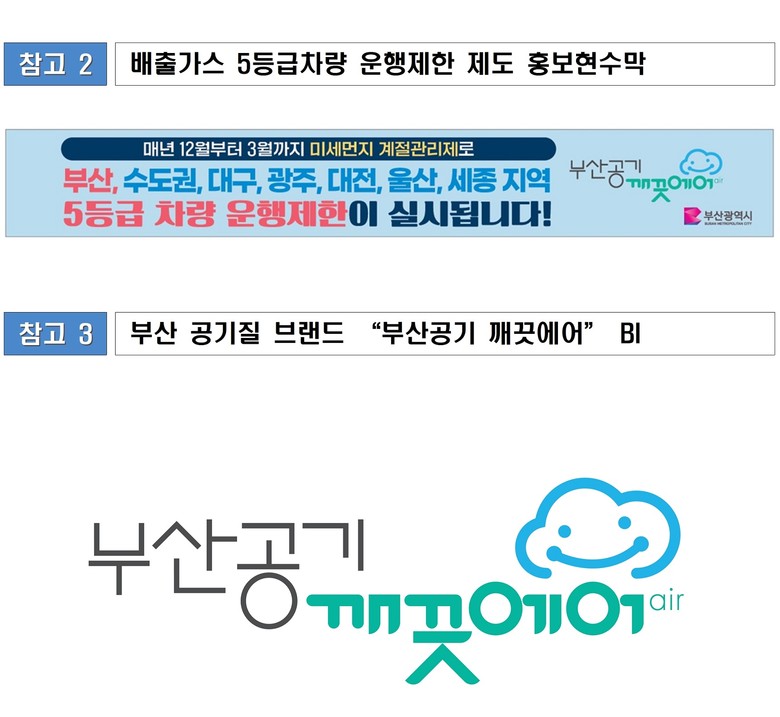 시는 부산 공기질 브랜드가 포함된 5등급 차량 운행제한 홍보 현수막 설치 및 관련 안내문을 배부할 예정이며, 참여기관들도 미세먼지 저감대책을 안내하는 현수막 및 홍보물 등으로 함께 홍보할 예정이다.