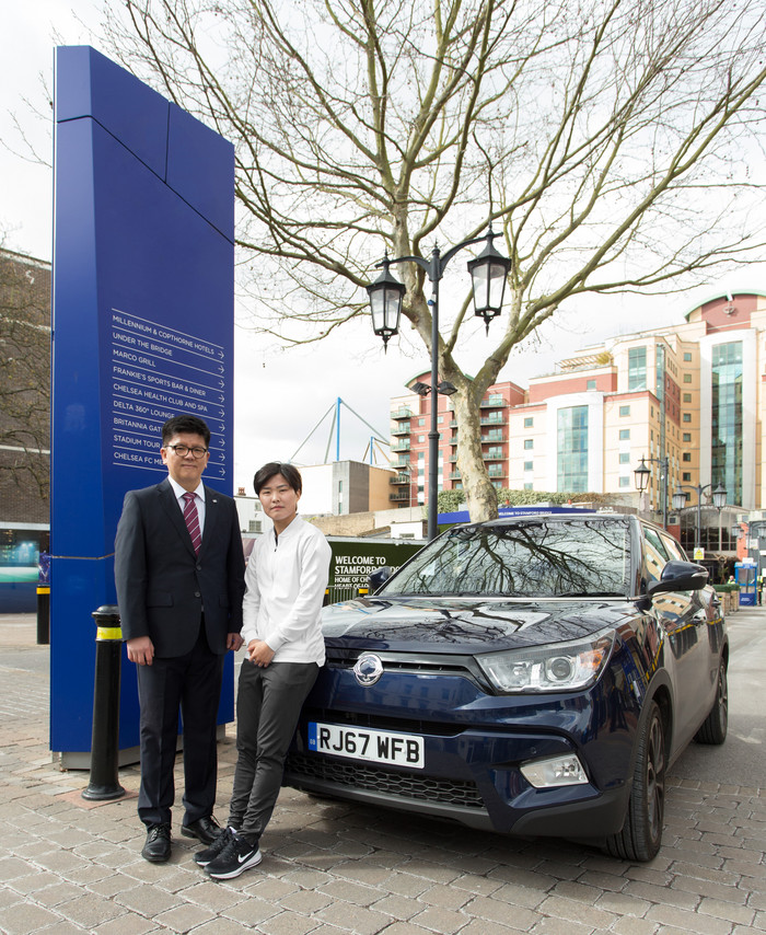 | ▲ 쌍용자동차가 스포츠마케팅 강화를 통한 브랜드 인지도 제고 및 한국 여자축구의 부흥을 응원하기 위해 한국 여자축구 간판스타이자 영국 첼시 레이디스(Chelsea Ladies)에서 뛰고 있는 지소연 선수와 후원 협약을 체결했다. 이번 협약을 통해 지소연 선수는 향후 영국 내 쌍용자동차 브랜드 홍보대사로서 다양한 활동에 참여할 예정이다. 쌍용자동차 유럽사무소 김준범 소장(왼쪽)과 지소연 선수(오른쪽)가 지난달 23일(한국시간) 영국 런던 첼시 홈구장인 스탬포드 브릿지(Stamford Bridge)에서 후원 협약을 체결하고 티볼리를 전달한 뒤 기념촬영을 하고 있다. |