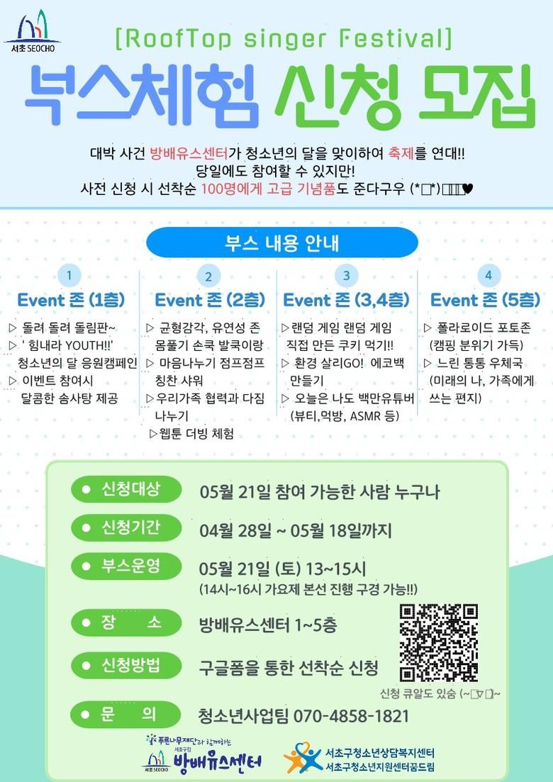 또, 21일에는 방배유스센터에서 가족과 함께 부스에서 체험하는 ‘방배유스데이’와 스트레스를 날리고 노래방 가수를 뽑는 ‘루프탑싱어’ 등이 열린다.