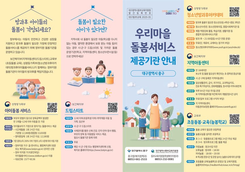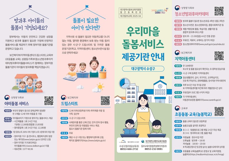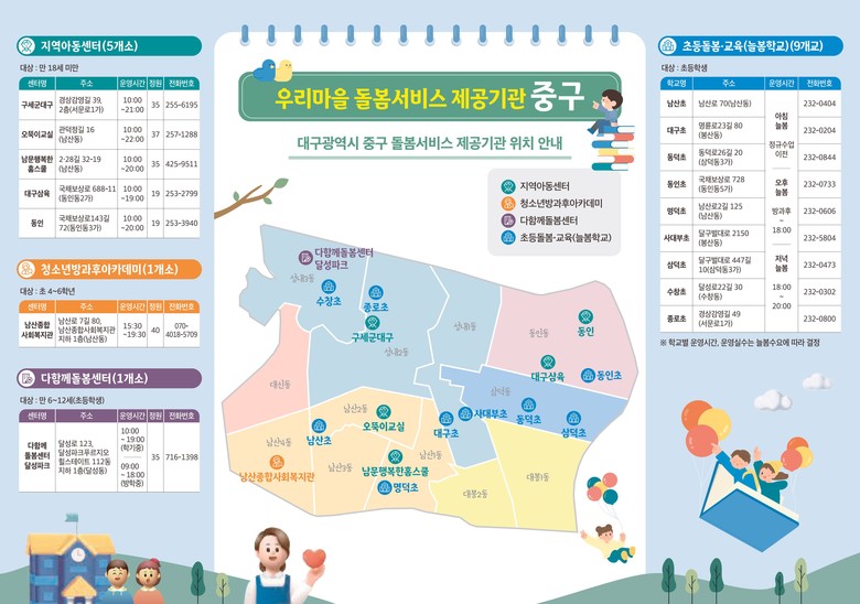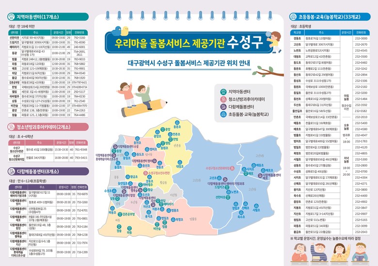 안내지도에는 동구, 수성구, 중구 등 자치구별로 ▲초등돌봄·교육(늘봄학교), ▲지역아동센터, ▲청소년방과후아카데미, ▲다함께돌봄센터 등 다양한 돌봄서비스 제공 기관의 운영 현황을 체계적으로 정리했다. 학교에서 학부모 상담이나 돌봄 연계 시 참고할 수 있도록 현장 활용성을 높인 자료로 제작되었다.