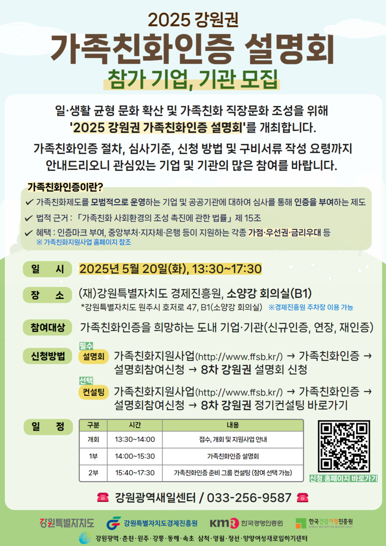 5월 19일 오후 3시까지 참가 기업 모집‧‧‧ 도 경제진흥원에서 열려 [강원도 세계타임즈=김민석 기자] 강원특별자치도(도지사 김진태)는 (재)강원특별자치도경제진흥원(강원광역새일센터)과 함께 ‘2025년 가족친화인증 설명회’에 참가할 기업 및 기관을 오는 5월 19일까지 모집한다고 밝혔다.