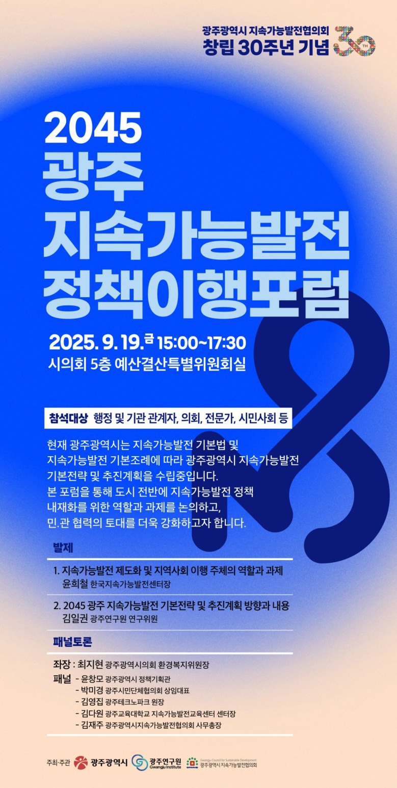 패널로는 김영집 광주테크노파크 원장(기업), 윤창모 광주시 정책기획관(행정), 박미경 광주시민단체협의회 상임대표(시민사회), 김다원 광주교육대학교 지속가능발전교육센터장(교육), 김재주 광주시 지속가능발전협의회 사무총장(거버넌스)이 참여한다.