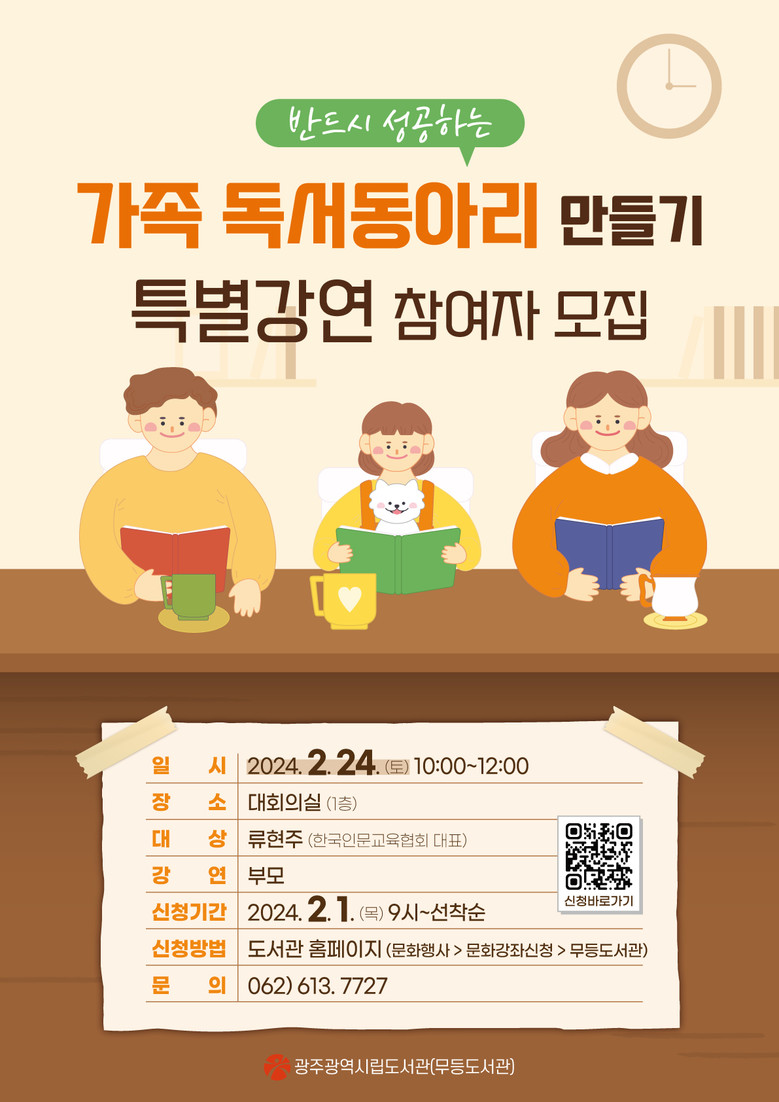 [광주 세계타임즈=손권일 기자] 광주광역시립무등도서관은 ‘반드시 성공하는 가족 독서동아리 만들기’ 특별강연을 오는 24일 오전 10시 무등도서관 대회의실에서 연다.