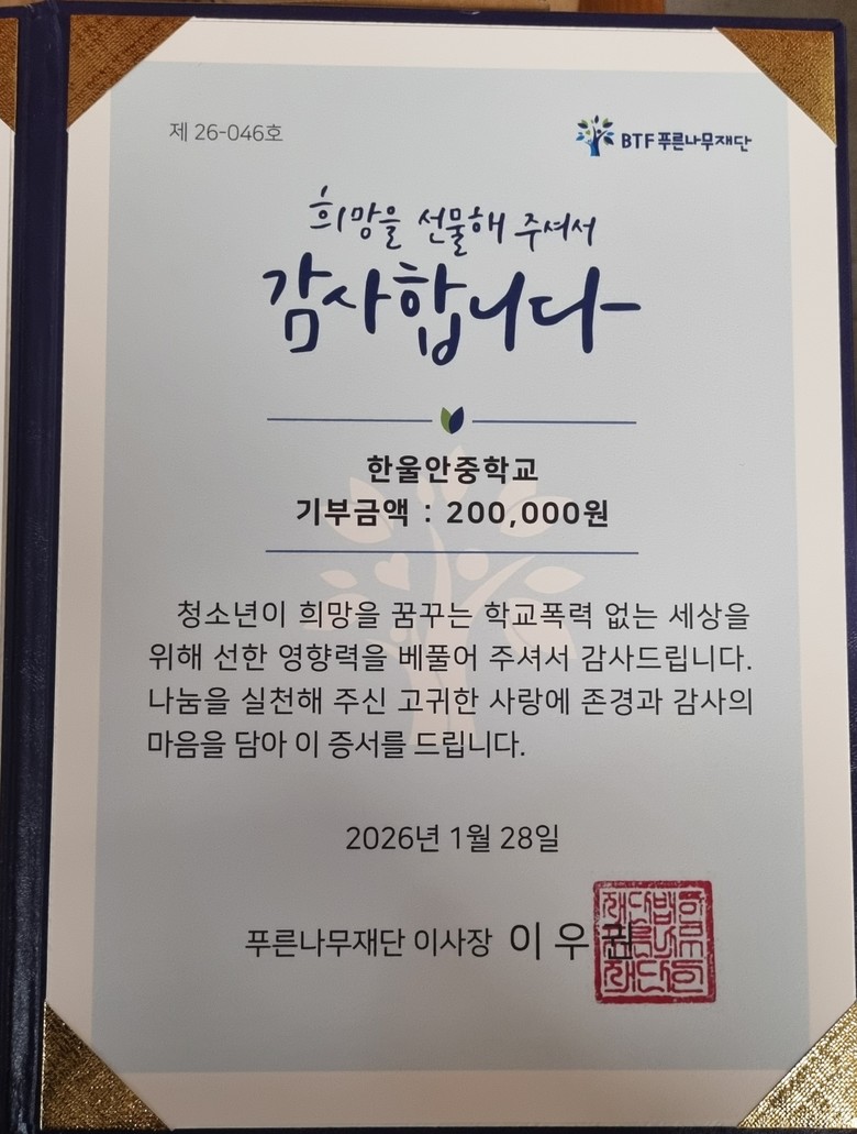 또한, 푸른나무재단에는 20만 원의 기부금을 전달하며 학교폭력 예방과 피해 학생 지원에 힘을 보탰다.