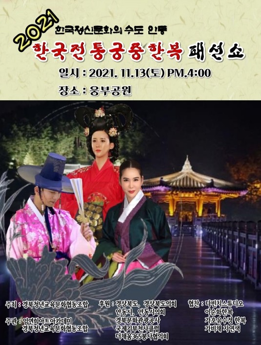 [세계타임즈 백진욱 기자] 오는 11월 13일 한국정신 문화의 수도 경북 안동시 웅부공원 야외특설무대에서 모두가 즐기는 한국전통 궁중복 패션쇼 in 2021 문화예술 축제 행사가 개최된다.