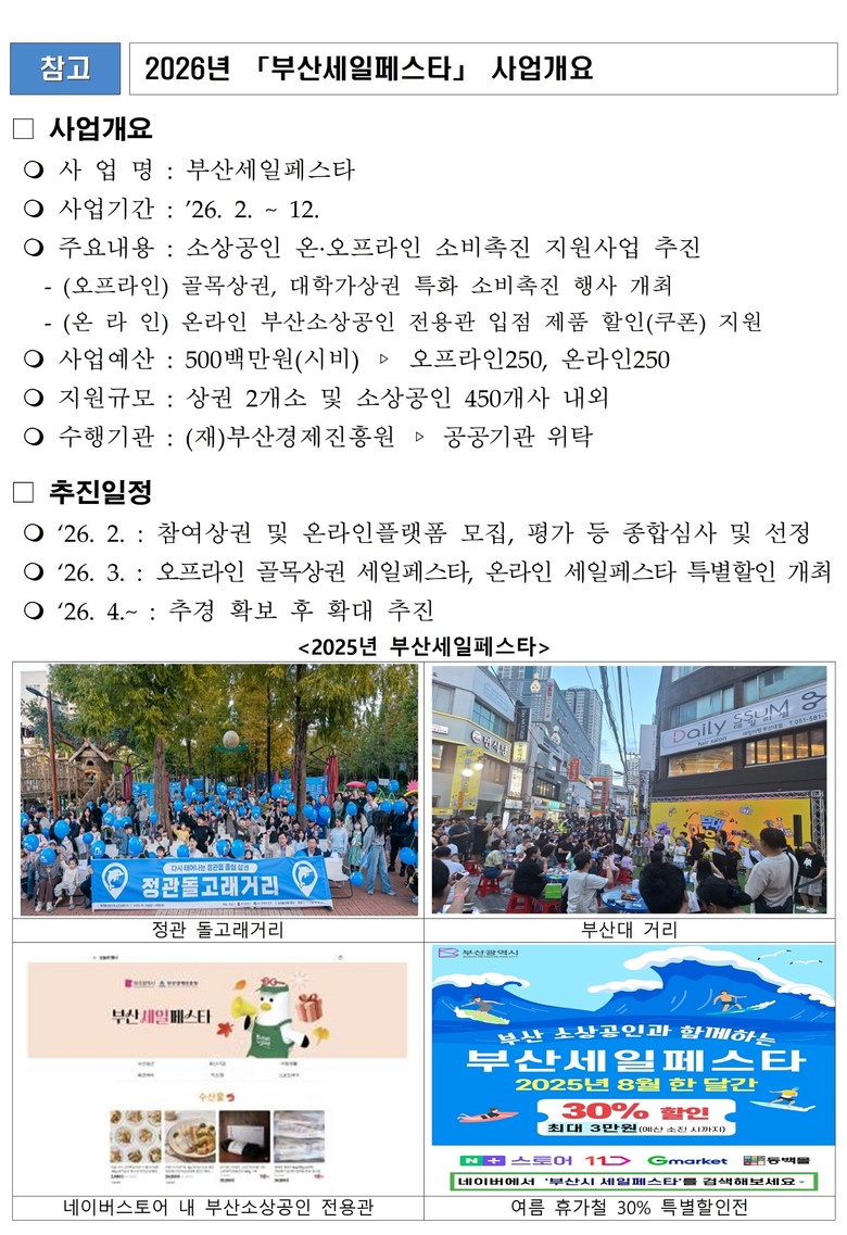 「부산세일페스타」는 2025년 처음 시행됐으며, ▲오프라인 4개 상권 275개 점포 참여로 매출 17억 4천만 원·방문객 6만 2천 명 ▲온라인플랫폼 4개 기업 참여로 입점 소상공인 351개 기업·매출 97억 원을 기록하는 등 지역 소상공인의 매출 증대에 기여했다.