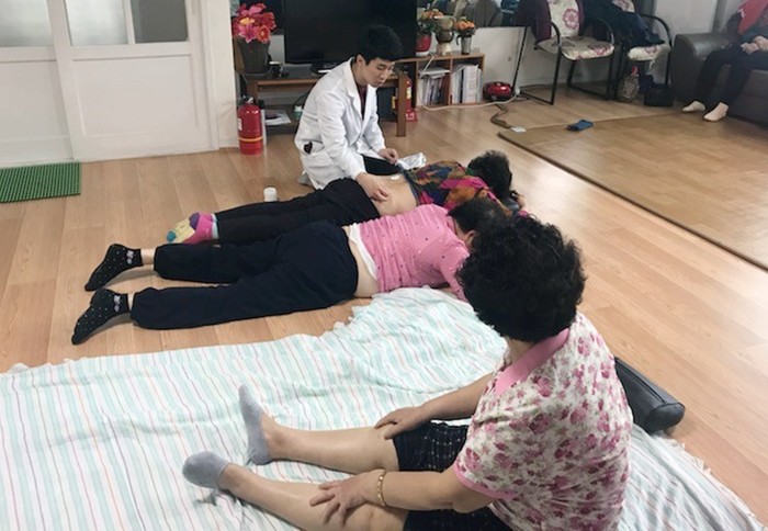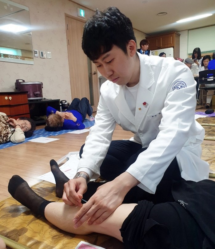 | ▲강남자생한방병원 의료진이 경로당을 방문한 환자에게 침 치료를 시행하고 있다. |