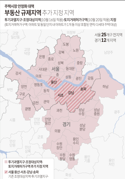 정부는 주택가격 상승에 따른 시장 불안이 서민 주거 안정을 위협하고 경제 활력을 저해한다고 보고 선제적 수요관리 조치를 통해 과열 양상을 조기 차단할 필요성이 있다고 판단했다.이에 따라 현행 서울 강남 3구(서초·강남·송파구)와 용산구를 포함한 서울 25개 자치구 전체와 경기도 12개 지역(과천시, 광명시, 성남시 분당구·수정구·중원구, 수원시 영통구·장안구·팔달구, 안양시 동안구, 용인시 수지구, 의왕시, 하남시)이 조정대상지역과 투기과열지구로 묶여 규제지역으로 추가된다.