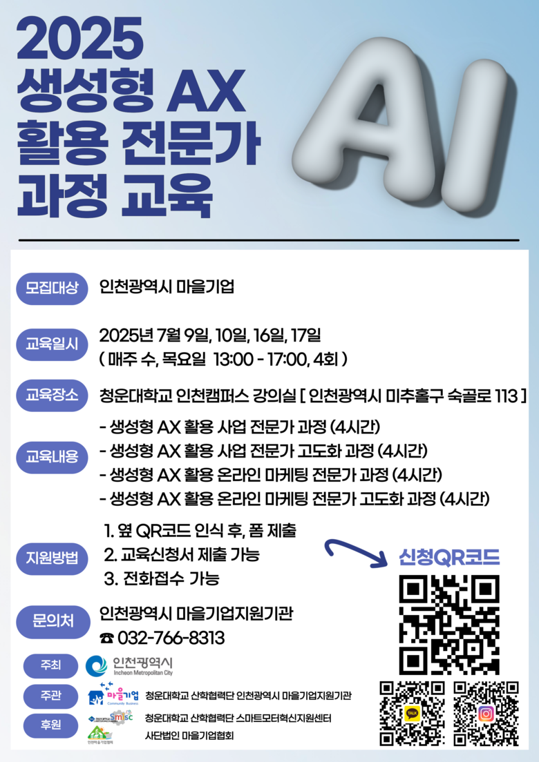 최근 생성형 인공지능(AI) 기술이 다양한 산업 분야로 빠르게 확산됨에 따라, 마을기업도 이를 실무에 적용할 수 있는 역량(AX)이 핵심 경쟁력으로 떠오르고 있다. 인천시는 이번 교육을 통해 마을기업의 실질적인 디지털 전환을 지원하고, 인공지능(AI) 도구 활용 능력을 강화할 계획이다.