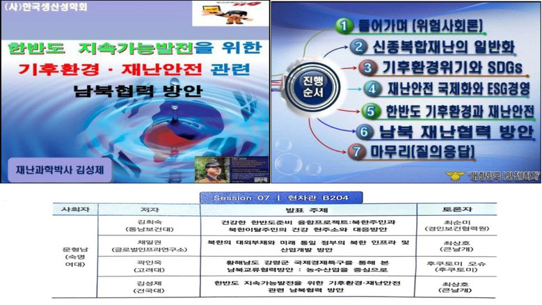 [세계타임즈 백진욱 기자] 2023년 5월 19일(금) 김성제(인천119특수대응단, 건국대 대학원 안보재난관리학과 겸임교수)가 고려대 현대자동차 경영관에서 개최되는 (사)한국생산성학회 춘계학술대회 세미나에서 순수학술 활동차원으로“한반도 지속가능발전을 위한 기후환경·재난안전 남북협력방안”을 주제로 연구논문을 발표했다.