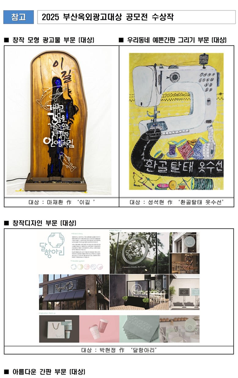 수상작은 9월 28일까지 시민공원 다솜갤러리에 전시되며, 간판의 변천사와 부산시 간판 교체사업을 소개하는 특별 테마 기획전도 함께 열려 부산의 공공디자인과 옥외광고문화의 미래 비전을 시민과 공유할 예정이다.