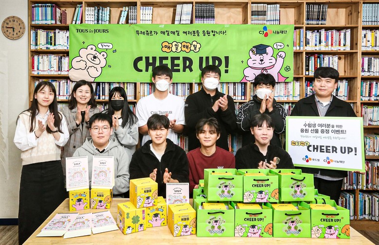 뚜레쥬르는 이번 수능 시즌 콘셉트인 ‘매일매일 치얼업’을 바탕으로, 수험생들을 응원하고자 CJ나눔재단과 함께 캠페인을 진행했다. 지난 30일부터 2주간 매일 CJ나눔재단이 지원하는 27개의 지역아동센터와 고등학교 수험생들에게 수능 선물세트 600여개와 응원의 메시지를 전달하는 등 특별한 추억을 선사했다.