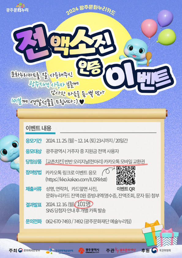 당첨자는 12월 16일 ‘광주문화누리’ 공식 블로그와 인스타그램·카카오톡 채널(광주문화누리카드) 등 사회관계망서비스(SNS)에 공지후 응모자 카카오톡 계정으로 기프티콘을 발송할 예정이다. 자세한 사항은 광주문화재단 예술누리팀(062-670-7492/7493)으로 문의하면 된다.