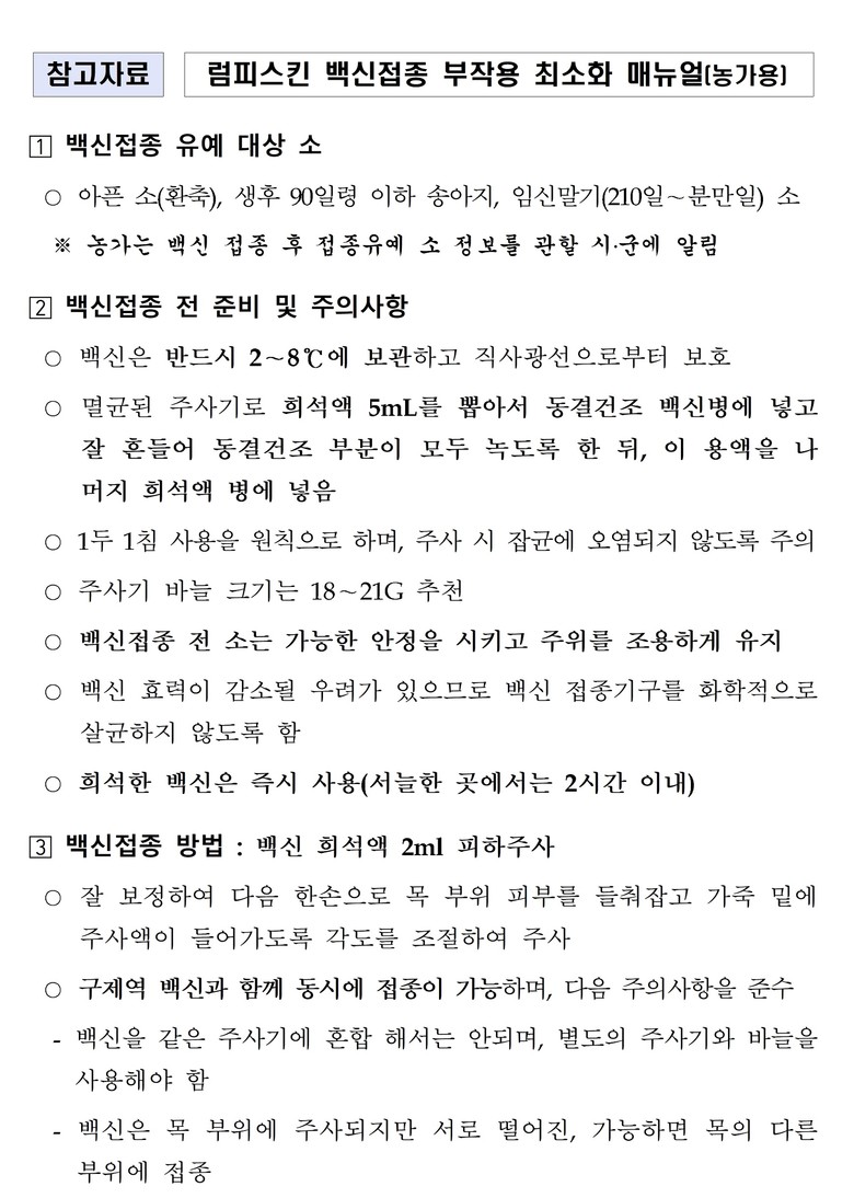 소규모 농가(50두 미만)는 시군 공수의 등의 전문 인력을 동원하여 접종을 지원하고, 전업규모 농가(50두 이상)는 자가접종을 원칙으로 하되 고령 등의 이유로 자가접종이 어려운 경우 수의사 등을 통해 접종 지원이 가능하다.