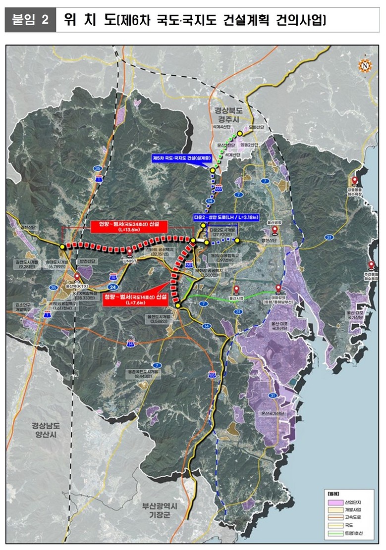 제6차 국도.국지도 건설계획 대상사업은 ▲언양~다운(L=13.6km, 5,481억 원) ▲청량~다운(L=7.6km, 3,853억 원) 국도 신설로 지난 2월 기획재정부 일괄 예비 타당성 조사 대상에 선정되어 현장 점검(5월) 후 국가계획 반영을 위한 중앙정부 협의를 진행 중이다.