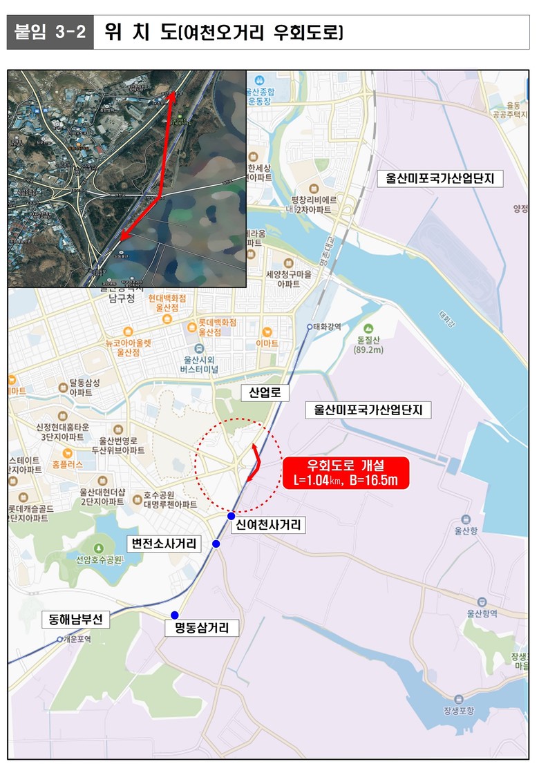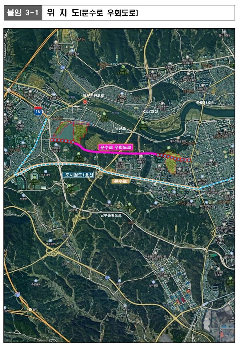 또 제5차 대도시권 교통혼잡도로 개선계획 대상사업은 ▲문수로 우회도로(L=2.71km, 1,360억 원) ▲여천오거리 우회도로(L=1.0km, 486억 원) ▲다운~굴화 우회도로(L=0.75km, 910억 원) 신설로 국가계획 반영을 위한 협의 절차를 진행 중이다.
