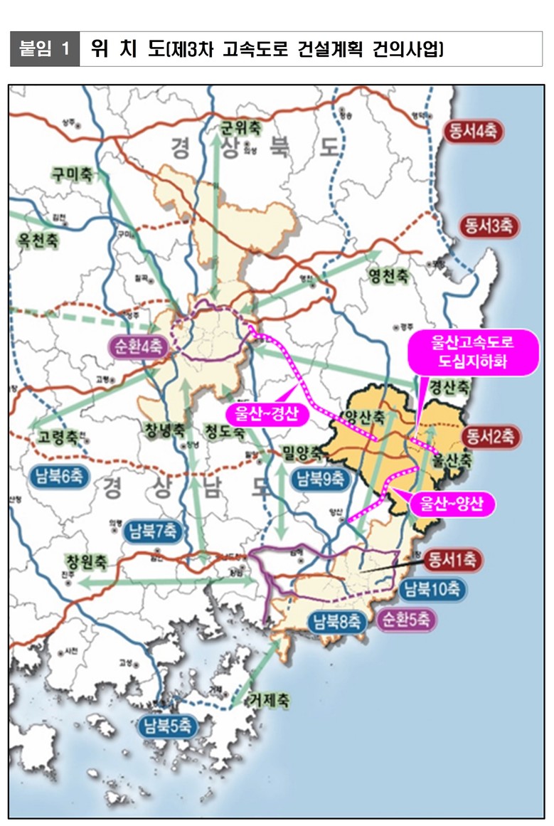 제3차 고속도로 건설계획 대상사업은 ▲울산~경산(L=50km, 3조 4,000억 원) ▲울산고속도로 도심지하화(L=11.5km, 1조 2,000억 원) ▲울산~양산(L=34.6km, 1조 4,990억 원) 구간에 대한 국가계획 반영을 위해 중앙정부와 협의를 진행 중이다.