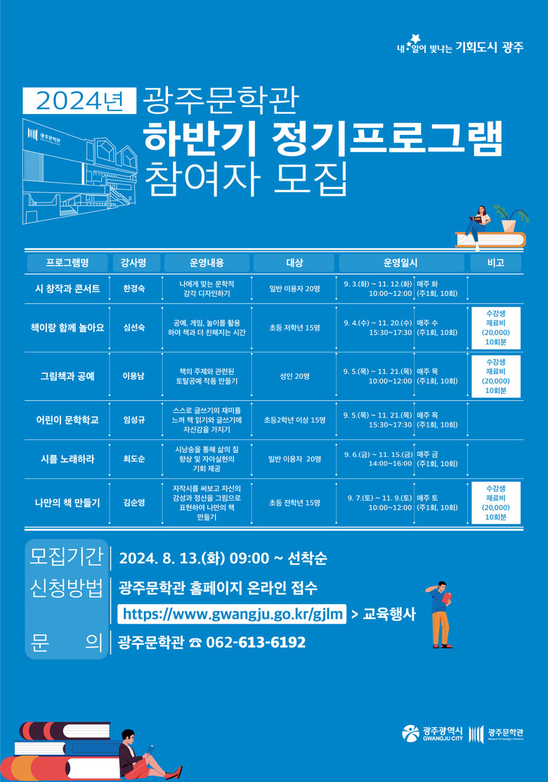 프로그램은 각 10차시로 9월부터 11월까지 운영하며, 수강생은 프로그램에 필요한 재료비만 부담하면 된다. 신청은 광주문학관 누리집(https://www.gwangju.go.kr/gjlm)에서 오는 13일 오전 9시부터 선착순으로 접수한다.