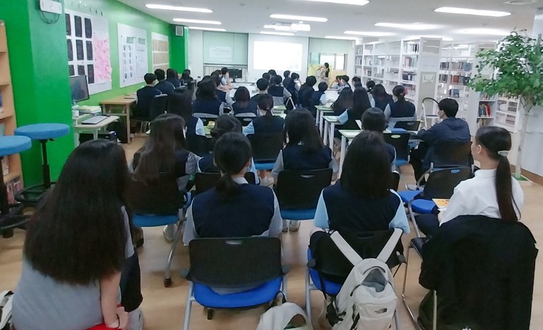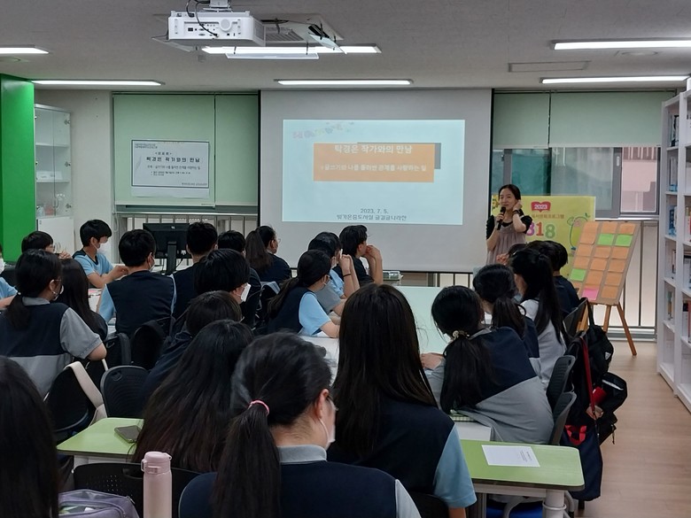 [광명시 세계타임즈=송민수 기자] 광명 소재 빛가온중학교(교장 한연희)는 지난 7월 5일 수요일, 동아리 시간을 활용하여 학교도서관에서 ‘글쓰기와 나를 둘러싼 관계를 사랑하는 일’을 주제로 청소년 소설가인 탁경은 작가를 만났다.