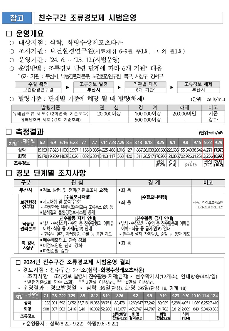 지난 9월 22일과 9월 29일 유해남조류 세포수 측정 결과 [삼락 수상 레포츠타운] 저점은 각각 밀리리터(ml) 당 ▲4천271개 ▲1만 7천973개, [화명 수상 레포츠타운] 지점은 각각 밀리리터(ml) 당 ▲3천256개 ▲1만 8천970개로 측정됨에 따라, 시는 조류경보를 해제했다.