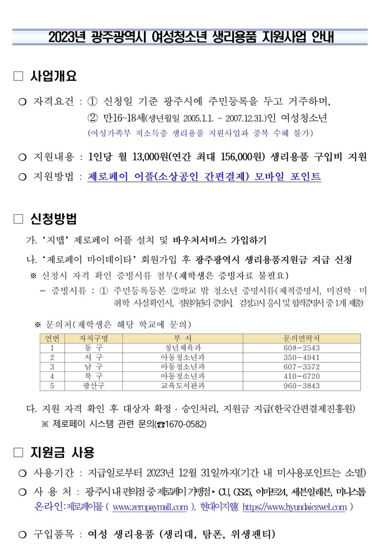 자세한 사항은 광주시 아동청소년과(062-613-4392)로, 신청시스템은 제로페이 고객센터(1670-0582)로 문의하면 된다.