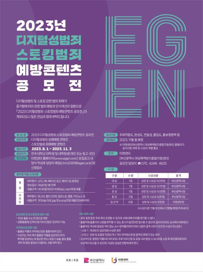 < 2023년 디지털성범죄‧스토킹범죄 예방 콘텐츠 공모전 개요 > ㅇ (공 모 명) 「2023년 디지털성범죄‧스토킹범죄 예방 콘텐츠 공모전」 ㅇ (공모기간) 2023. 8. 1.(화) ~ 11. 3.(금) ㅇ (공모주제) 디지털성범죄‧스토킹범죄 예방 콘텐츠 ㅇ (참가대상) 전국 대학교 대학생 및 대학원생(개인 또는 팀 2-3인) ㅇ (선정규모) 12개 작품(대상1, 금상1, 은상1, 동상3, 입선작6) ※ 부산광역시장상(6), 이젠센터장상(6), 상금 제공(총580만원) |