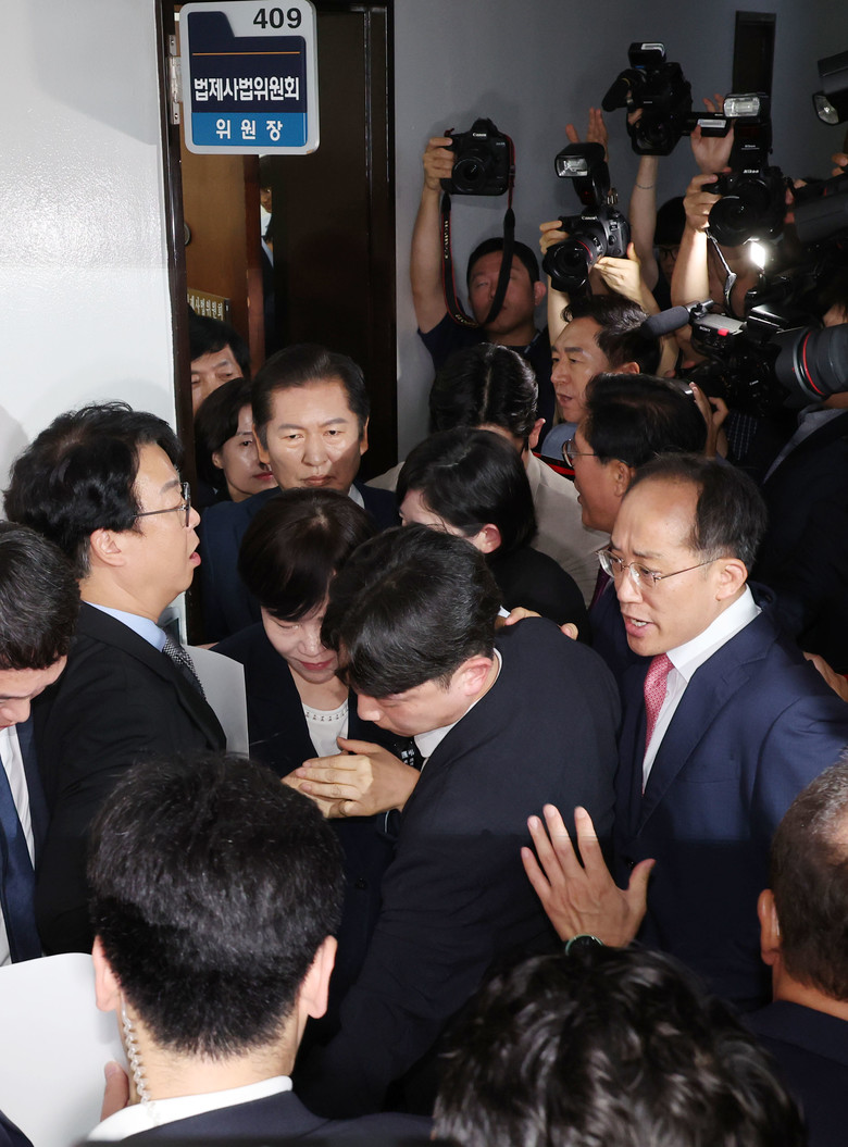 [세계타임즈 = 이채봉 기자] 정청래 국회 법제사법위원회 위원장이 국민의힘 의원들의 항의를 받으며 19일 오전 '윤석열 대통령 탄핵소추안 발의 요청' 국민동의 청원 청문회가 열리는 회의장으로 향하고 있다.