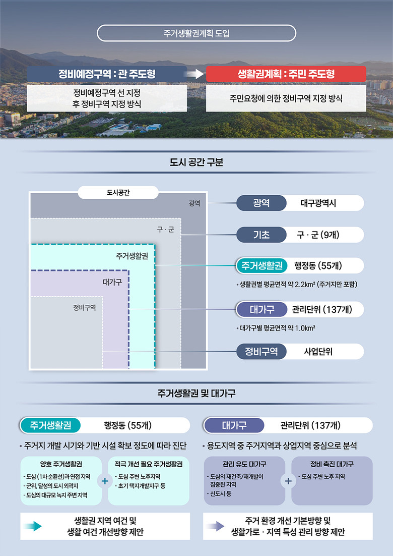 대구시는 기존 지산·범물동 일원에서 시범 운영한 ‘주거생활권계획’을 대구시 전역으로 확대하고, 5년마다 일괄 지정하던 ‘정비예정구역’ 방식에서 벗어나 주민들이 직접 설정한 구역에서 정비사업을 추진할 수 있는 기반을 마련했다.