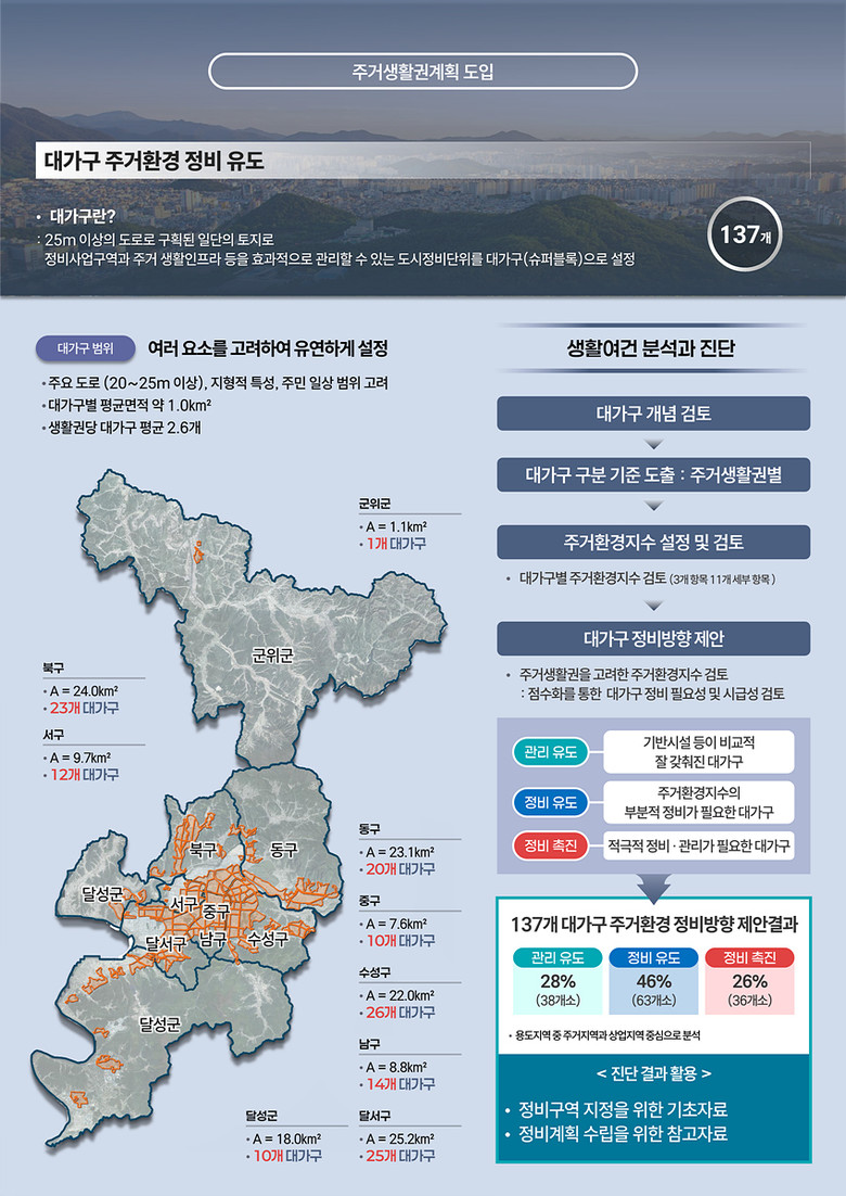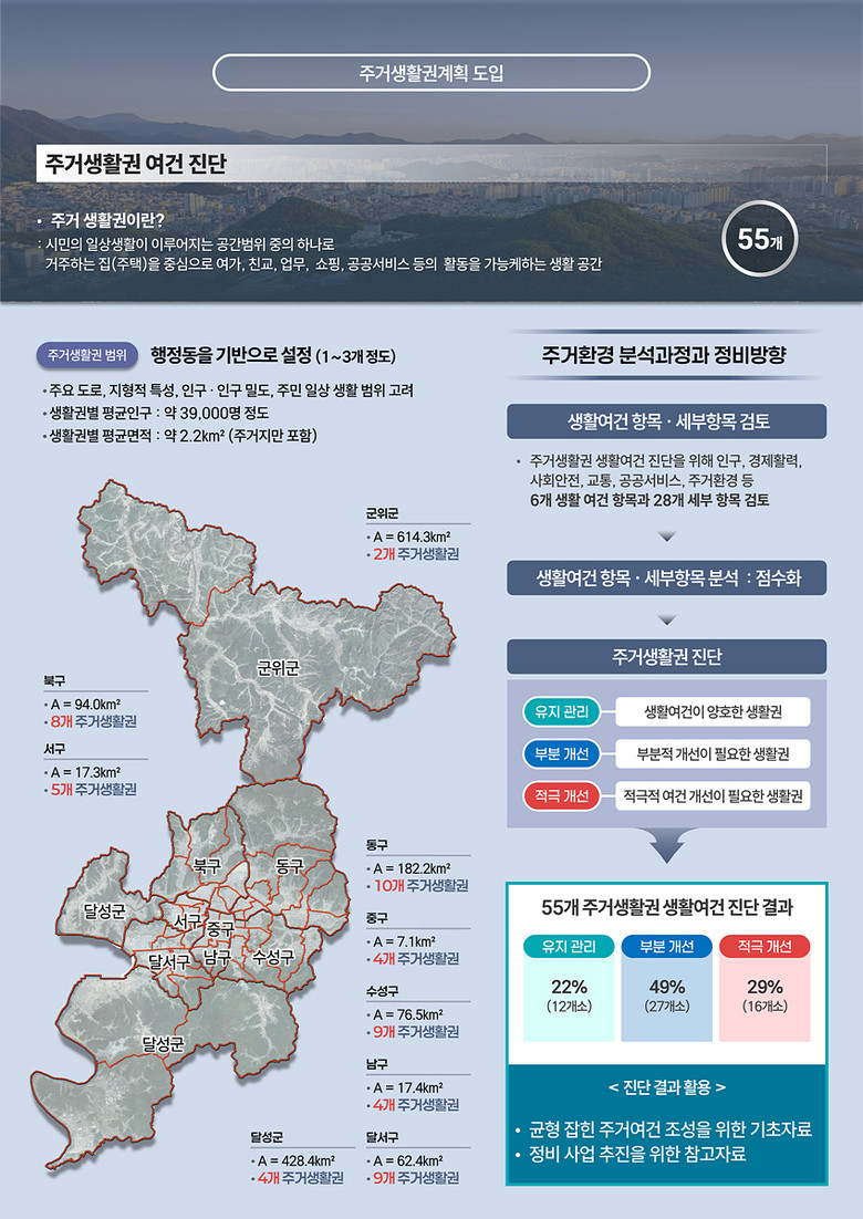 균형 잡힌 주거 여건 조성을 위해 대구시 도시공간을 55개 주거생활권으로 나누고, 6개 지표(인구, 경제활력, 사회안전, 교통, 공공서비스, 주거환경)를 분석해 각 주거생활권의 여건을 진단했다. 이는 지역 생활여건 개선 방향의 기초자료로 활용할 예정이다.