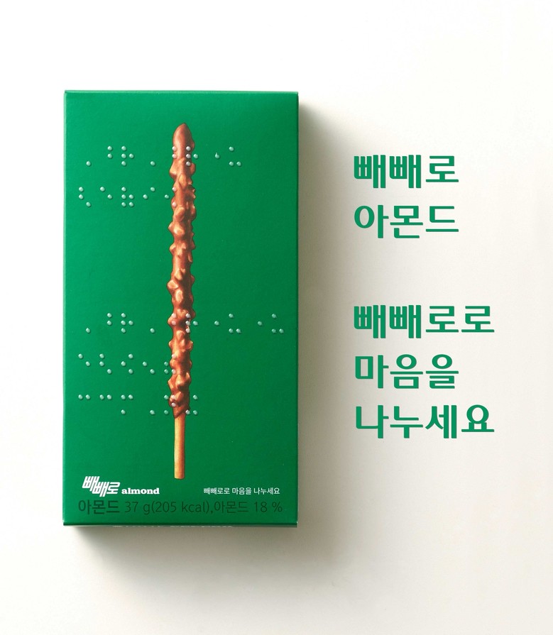 이번에 기부된 아몬드 빼빼로 점자 패키지 한정판은 전면 상단에 ‘빼빼로 아몬드’가 점자로 새겨져 있다. 전면 하단에는 빼빼로의 브랜드 메시지를 담은 ‘빼빼로로 마음을 나누세요’가 점자로 적혀있다. 측면에도 ‘빼빼로 아몬드’가 점자로 적혀있으며, 취식 편의성을 높이기 위해 후면에는 상자 개봉을 위한 ‘열림’ 표기도 빠뜨리지 않았다.