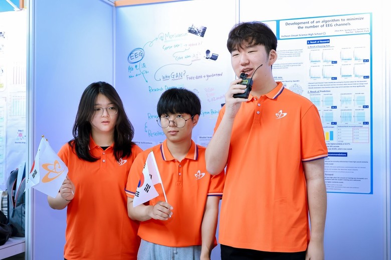 인천진산과학고 2학년 김지후, 고서현 학생과 1학년 유태현 학생은 박기범 지도교사와 함께 우리나라 대표로 행사에 참가했다. 이들은 ‘뇌파 측정 센서 채널 수를 줄이기 위한 알고리즘 개발(Development of an algorithm to minimize the number of EEG channels)’을 주제로 프로젝트를 진행하고 그 과정과 결과를 발표했다.