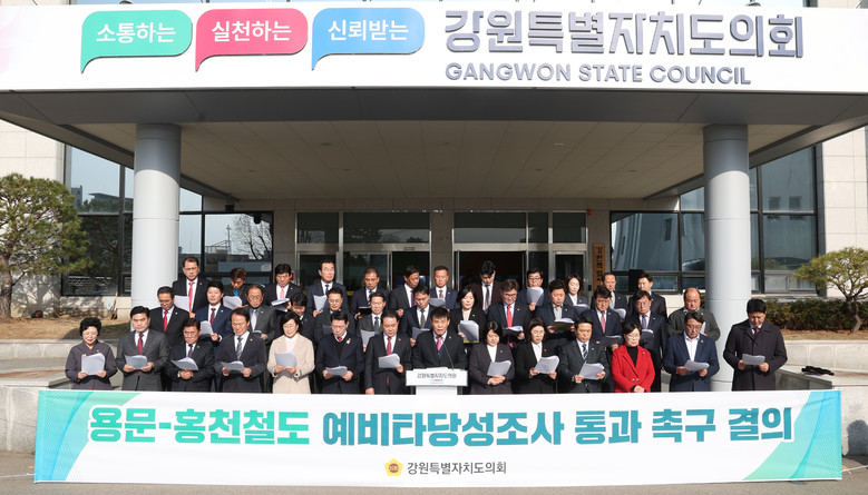 결의문을 대표 발표한 이영욱 의원은 “용문-홍천 광역철도 사업은 지역주민과 군장병의 이동권 향상과 복지 증진에 크게 이바지하는 것 뿐만 아니라, 지역균형발전과 지역 소멸 위기 극복의 초석이 될 것”이라고 밝히며, “용문-홍천 광역철도는 홍천군민의 100년의 꿈인만큼 예비타당성조사가 조속한 시일 내에 통과되고, 조기 착공 할 수 있도록 정부와 관계기관의 적극적인 지원과 협조를 요청한다”고 밝혔다.