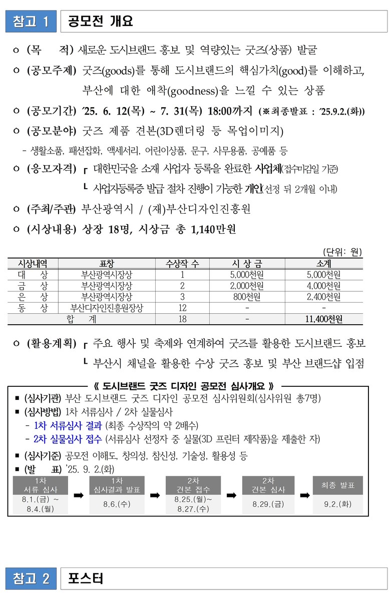 시는 1차 서면 심사와 2차 실물 평가를 거쳐 총 18점의 수상작(부산광역시장상 6, 부산디지인진흥원장상 12)을 선정하며, 이 중 대상 디자인에 최대 500만 원의 상금 등을 지급할 계획이다.