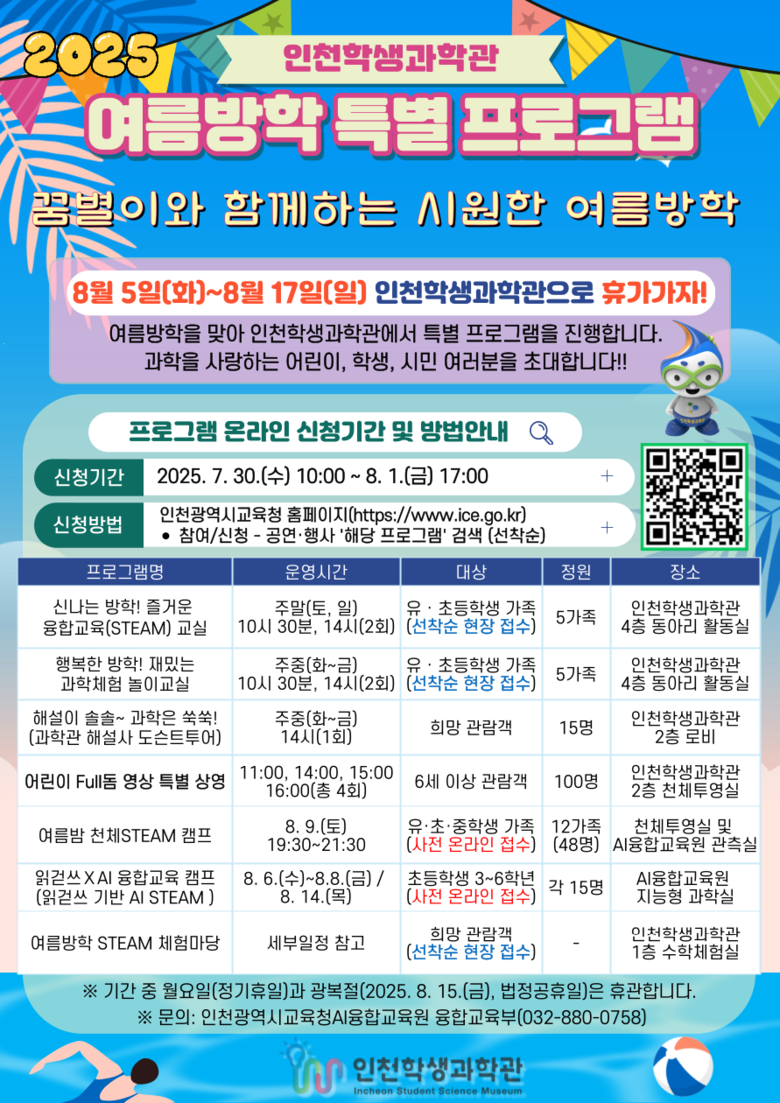참여 신청은 7월 30일(수) 오전 10시부터 인천광역시교육청 누리집 ‘참여/신청’-‘공연・행사’ 메뉴에서 일부 프로그램을 사전 신청할 수 있으며, 나머지는 현장 접수로 참여 가능하다.