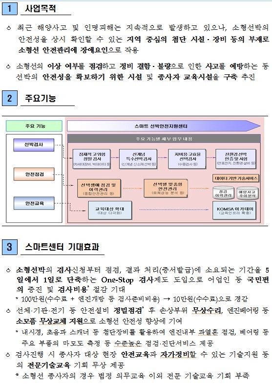 101억원 전액 국비로 건설될 인천 스마트 선박안전지원센터는 중소형 선박의 검사 및 안전점검과 선박 종사자 대상 해양안전교육 프로그램 운영을 함께 할 수 있는 복합시설로 최신 선박검사・안전점검 정비와 선박 종사자 교육시설 등을 갖추게 된다.
