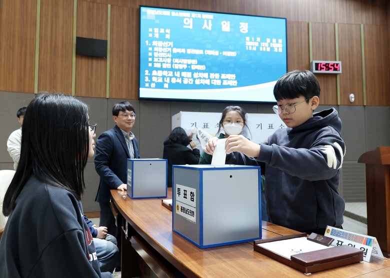 이날 의회교실에서 홍성 내포초등학교 학생들은 의장 선거에 출마한 후보들의 정견 발표를 듣고, 직접 투표해 의장을 선출하는 과정을 체험하며 주민대표인 도의원의 역할을 이해했다.