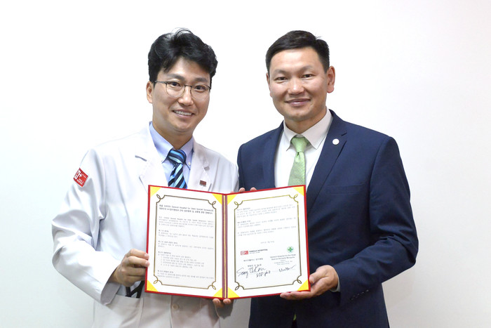 | ▲에이치플러스 양지병원 김상일 병원장과 몽골 울란바토르 소재 종합병원 GHSSS 바트투르 병원장(우측) 이 29일 에이치플러스 양지병원에서 포괄적 의료협약을 체결했다. |