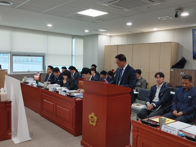 | ▲업무 보고 발표하는 이재준 대표이사 및 피감 관계자들 모습. |