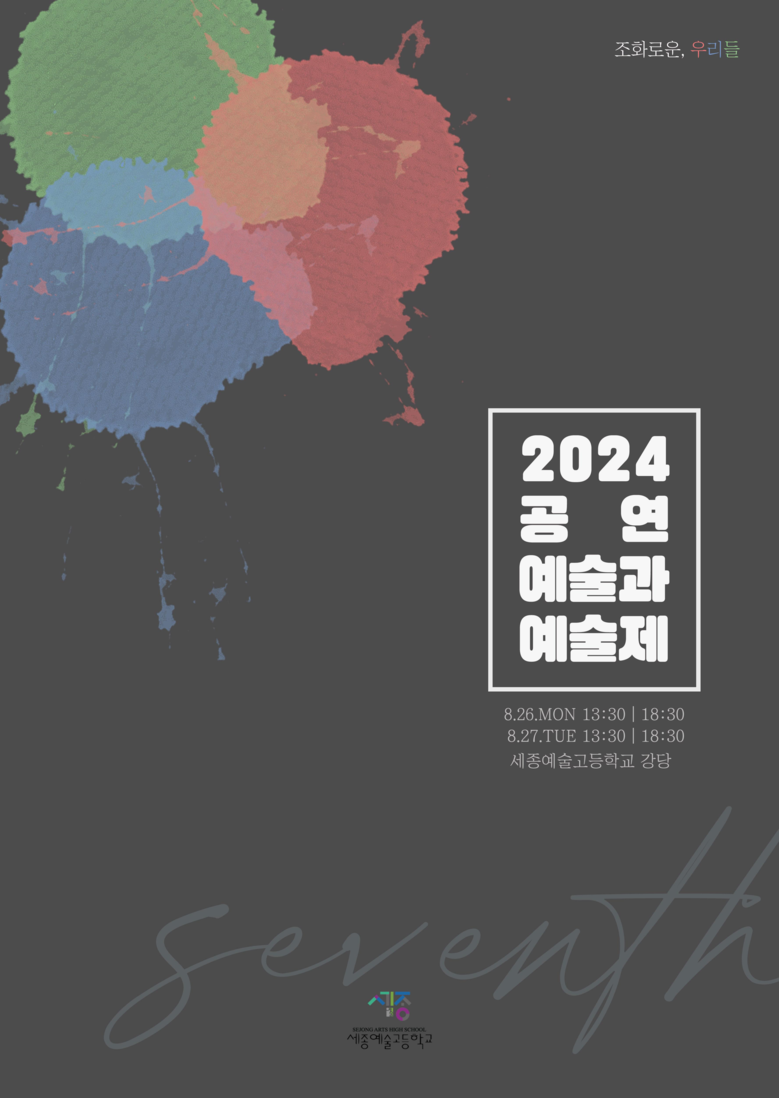 [세종 세계타임즈=이채봉 기자] 세종예술고등학교(교장 황덕수, 이하 세종예술고) 공연예술과 학생들이 제작한 제7회 공연예술과 예술제가‘팔레트:우리의 색을 합치다’를 주제로 오는 26일과 27일 이틀에 걸쳐 세종예술고 강당에서 열린다.