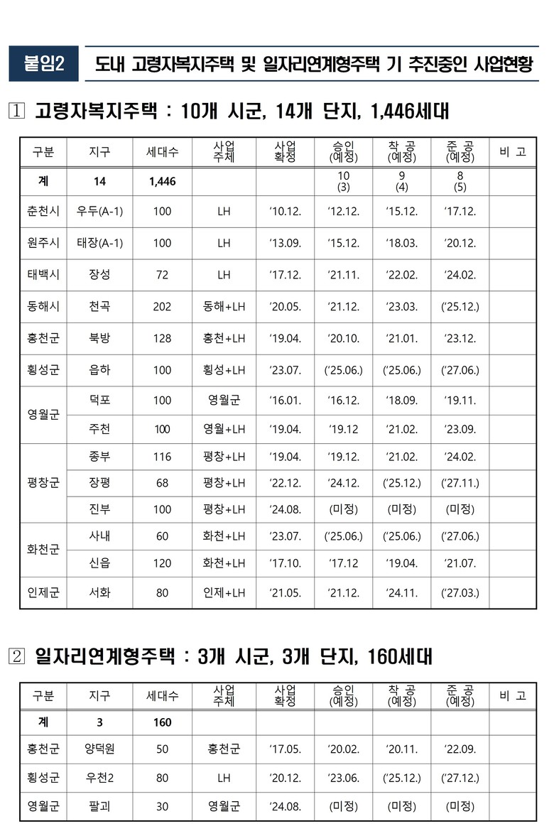 한편, 현재 진행 중인 고령자복지주택사업은 도내 10개 시군(춘천,원주,태백,동해,홍천,횡성,영월,평창,화천,인제) 14개소(1,446호)에서 추진되고 있다. 일자리연계형 지원주택 사업은 3개 시군(횡성,홍천,영월) 3개소(160호)에서 진행 중이며, 이번에 최초 시행되는 지역제안형 특화주택사업도 시군과 함께 적극적으로 추진할 예정이다.
