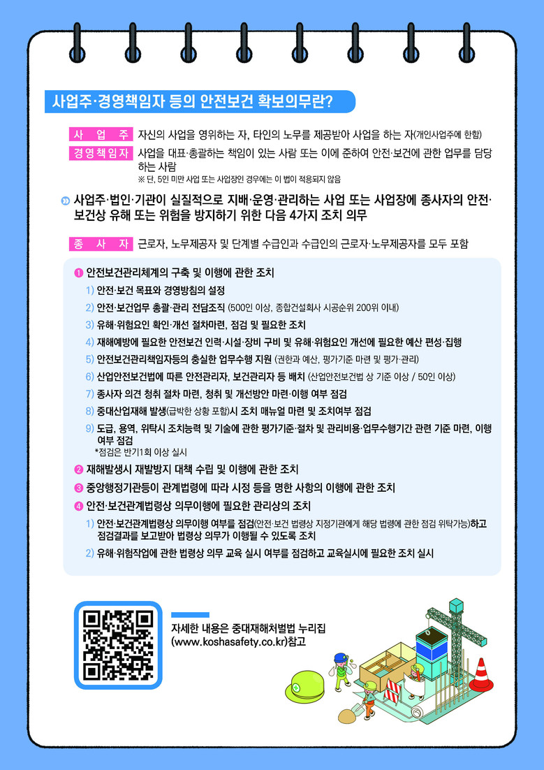 한편 중대재해처벌법은 중대재해 발생 때 무조건 사업주와 경영책임자 등이 처벌되는 것은 아니며 산업안전보건법 등 개별 법령 준수사항 및 안전보건관리체계 구축 등 사업주와 경영책임자 등의 안전 및 보건 확보 의무를 이행하면 처벌은 면하게 된다. 중대재해처벌법에 대한 자세한 내용은 중대재해처벌법 누리집(www.koshasafety.co.kr)에서 확인할 수 있다.